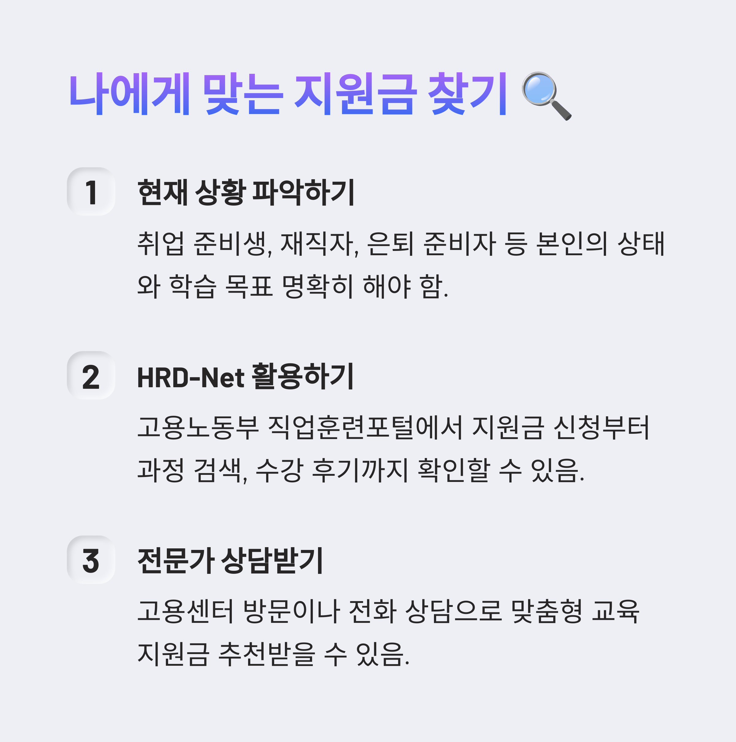 - 다양한 종류 파악: 내일배움카드, 취업성공패키지, 지자체 지원금 등 나에게 맞는 지원금을 찾아보세요.