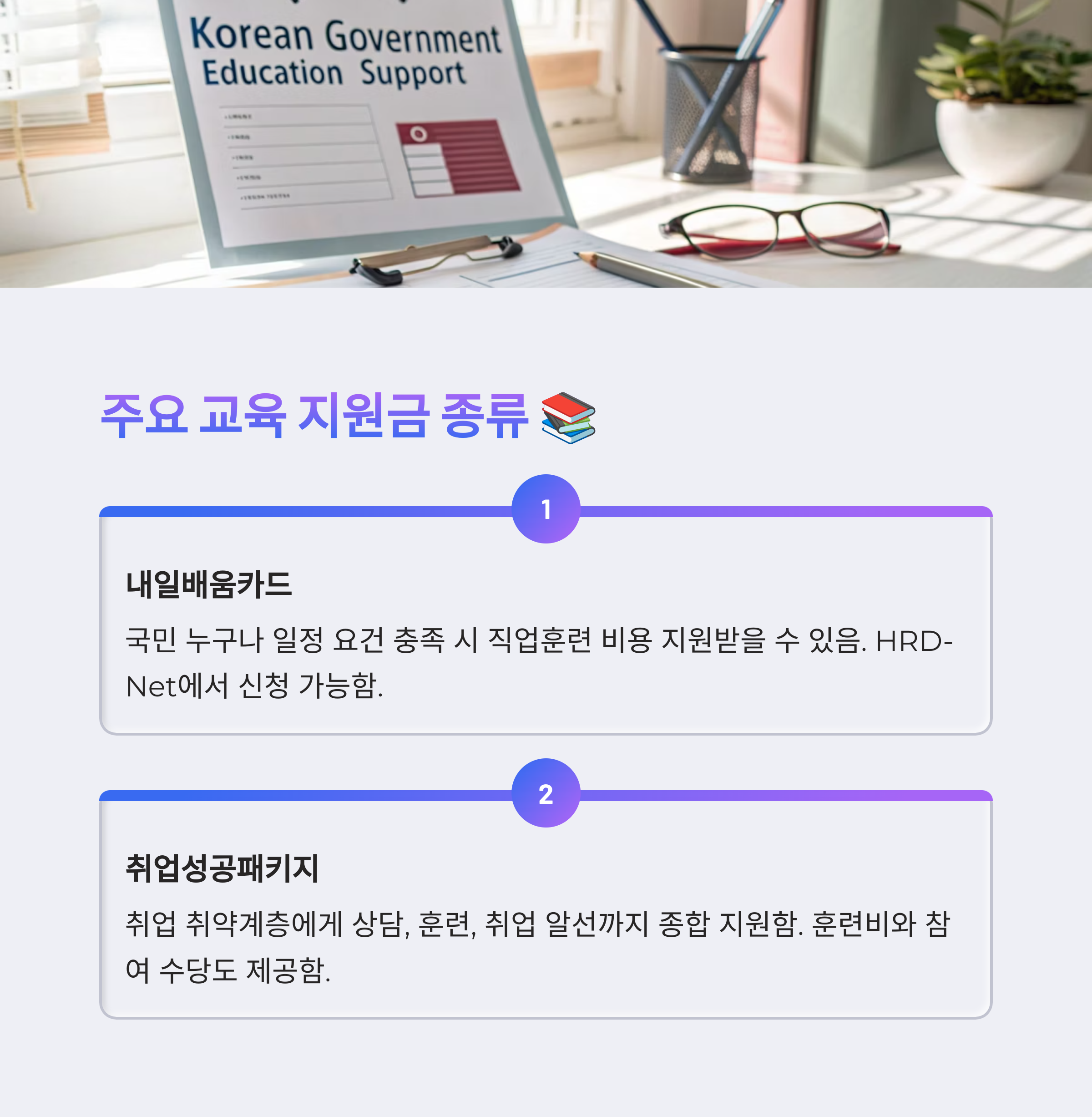 가장 대표적인 교육 지원금으로는 고용노동부에서 운영하는 '내일배움카드'가 있어요. 아마 한 번쯤 들어보셨을 거예요. 이 외에도 정말 다양한 지원 제도들이 있답니다!