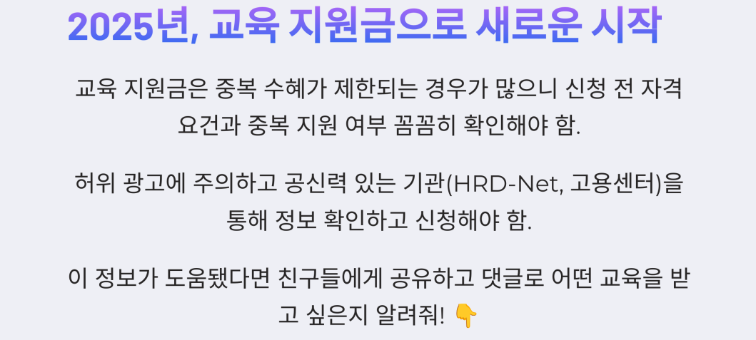 일부 사설 기관에서 "100% 지원금 받을 수 있다"며 허위 광고를 하는 경우가 있어요. 반드시 공신력 있는 기관(HRD-Net, 고용센터 등)을 통해 정보를 확인하고 신청해야 합니다.