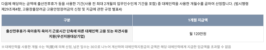 - 대체인력 고용: 육아휴직 시작일 전 2개월부터 육아휴직 종료 후 6개월 이내에 대체인력을 신규 채용하고, 3개월 이상 고용한 경우에 지원받을 수 있습니다. (단, 대체인력을 고용하지 않아도 지원금을 받을 수 있는 경우가 있어요! 아래에서 자세히 설명해 드릴게요!)