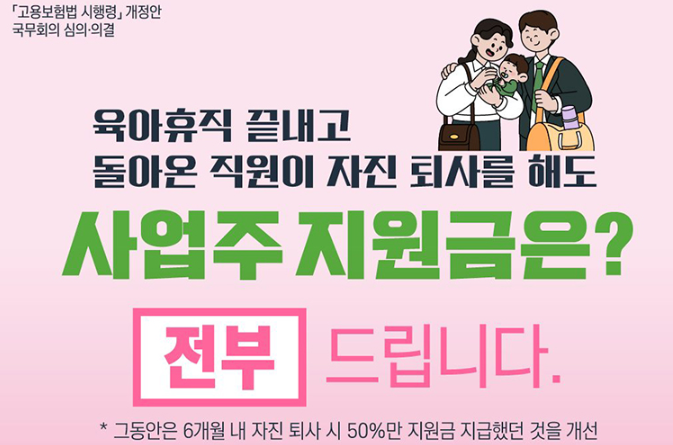 2025년 7월1일 부터는 직원이 육아휴직 후 자발적으로 퇴사해도 사업주는 전액 지원금을 받을 수 있도록 제도가 바뀌었어요....