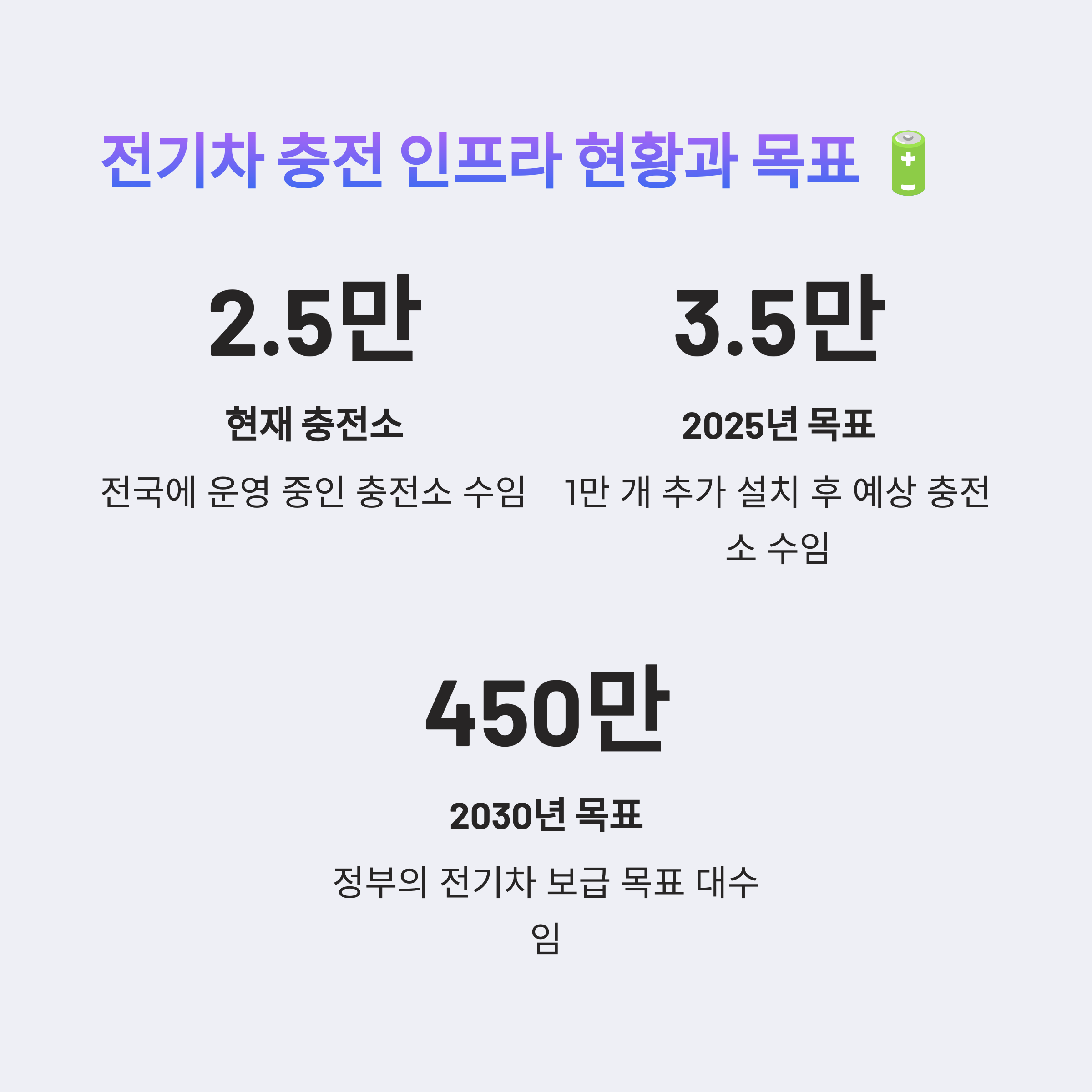 - 정부의 강력한 의지: 2025년까지 전기차 충전소 1만 개 추가 목표 설정과 2조 원 예산 투입.