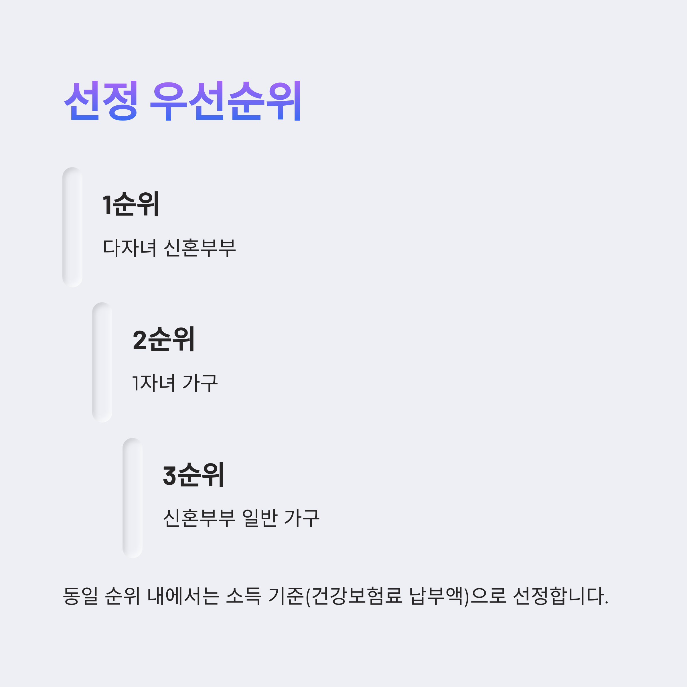 둘째, 1자녀 가구가 2순위, 신혼부부 일반 가구는 3순위로 구분됩니다.