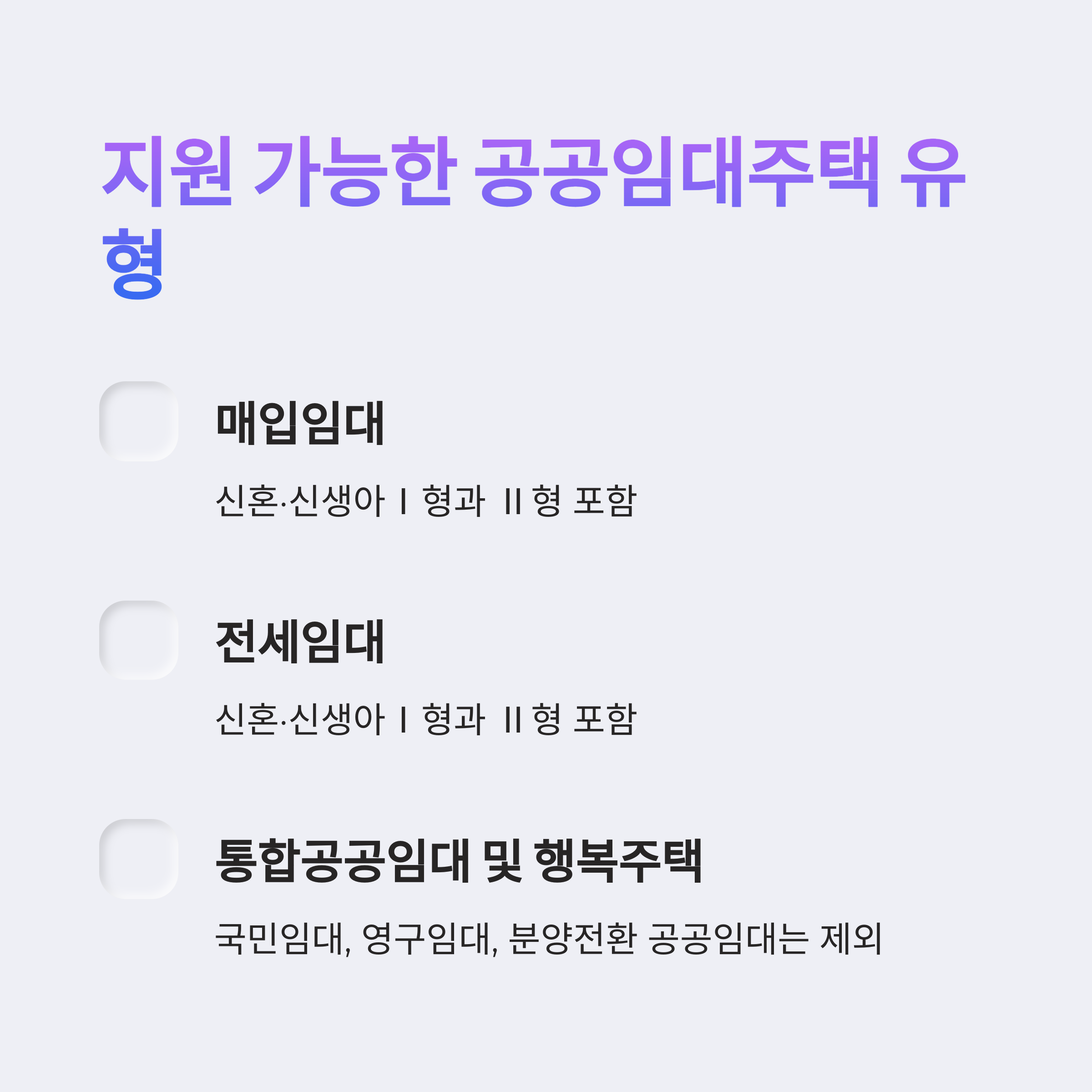 신청 가능한 주택 유형은 매입임대, 전세임대, 통합공공임대, 행복주택 등이며 기타 공공임대 유형은 대상에서 제외됩니다.