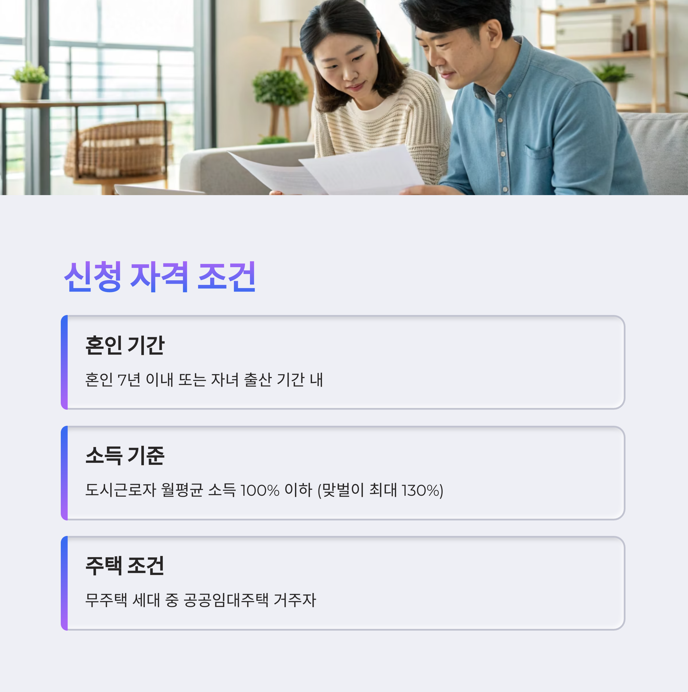 특히 소득 기준은 도시근로자 월평균 소득 100% 이하(맞벌이의 경우 최대 130%까지 인정)로 설정되었습니다.