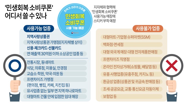 - 사용처: 주소지 관할 연 매출 30억 이하 소상공인 점포 (대형마트, 백화점 등 불가).